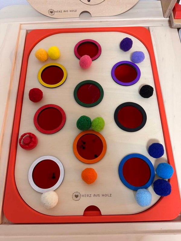 Diese liebevoll gestaltete Holzplatte lädt Kinder dazu ein, mit PomPoms, Quetschiestöpseln oder bunten Seidentüchern zu experimentieren und ihrer Fantasie freien Lauf zu lassen.